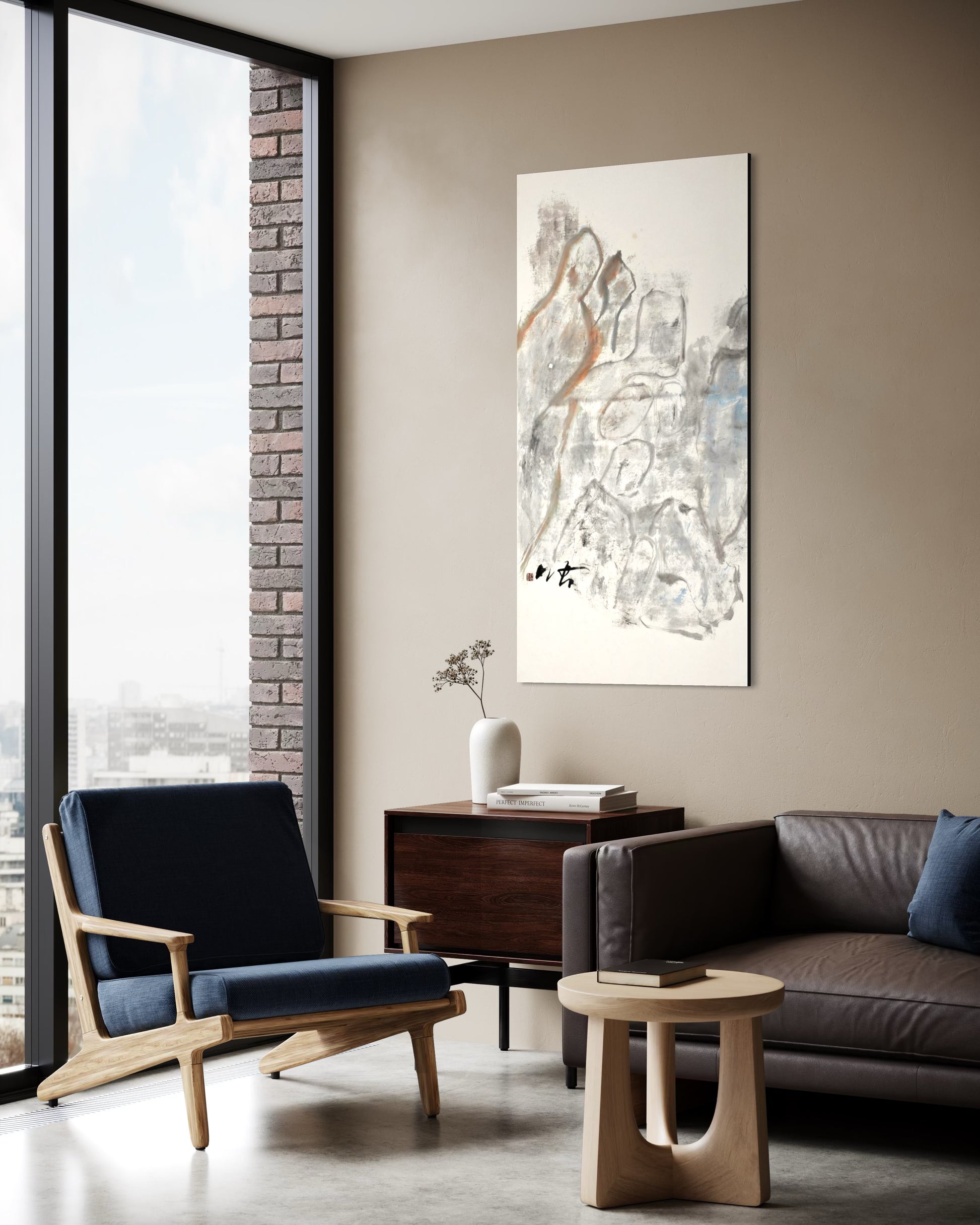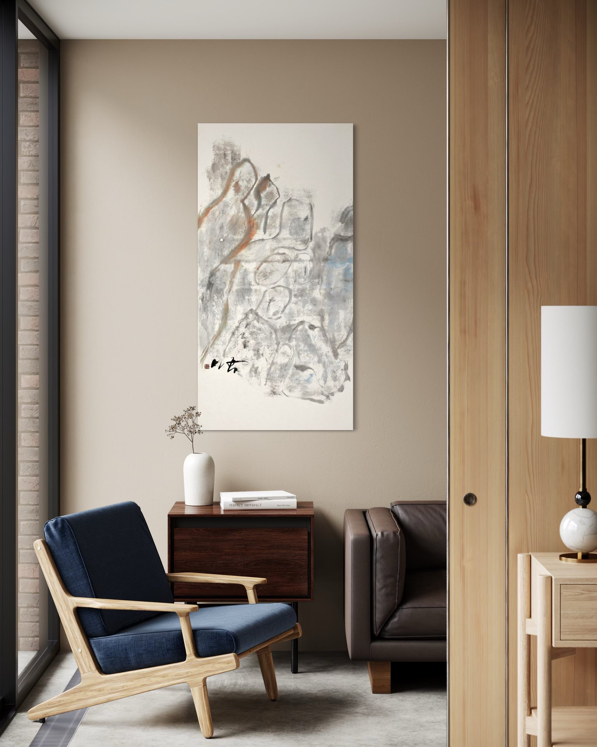 Echoes in the Mist by Guoliang Xu is a delicate meditation on form, memory, and the ephemeral. Using soft washes of grey, pale blue, and earthy ochre, Xu shapes ghostlike silhouettes that emerge from a misty, textured background. The figures appear to float between solid presence and fading memory, evoking a dreamlike landscape where mountains, people, and spirits coexist. With minimal but expressive brushwork, Xu blurs the line between abstraction and figuration, inviting viewers to interpret the scene as a metaphor for transience, ancestry, or inner reflection.